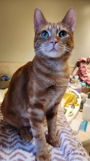 Carys is a stunning short-haired orange tabby, her swirling coat and enchanting green eyes capturing the heart at first glance. She carries herself with gentle elegance, and her kind spirit truly shines through. Although her early days were filled with uncertainty and fear, Carys has embraced indoor life with remarkable resilience, growing not only into her own gentle nature but also into a loving, attentive cat.