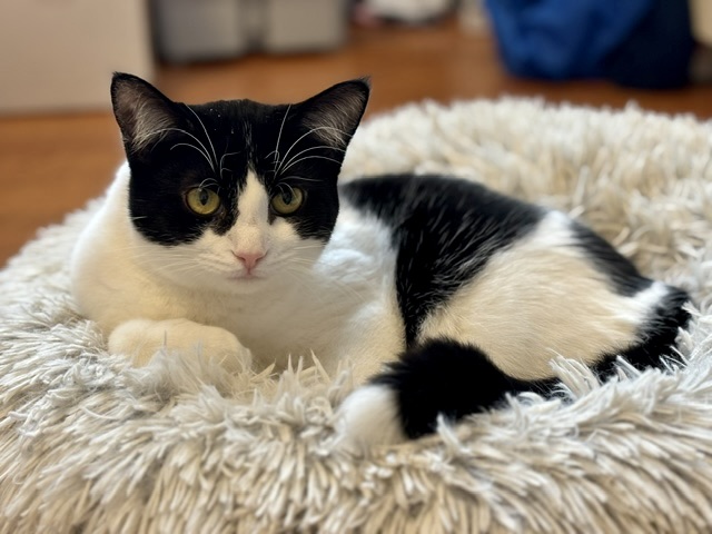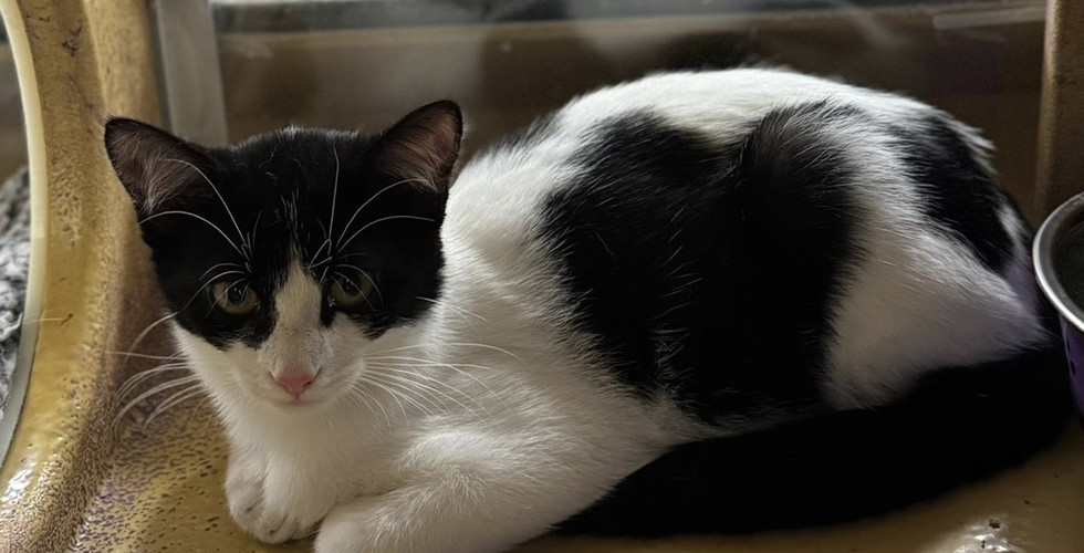 Trixie is a playful black-and-white kitten with a shy-but-silly personality that comes out once she feels safe. She loves batting at toys and showing off her sneaky little zoomies. While she’s not quite ready to be picked up, she adores pets and will happily stick around for as long as the scratches and snacks keep coming.